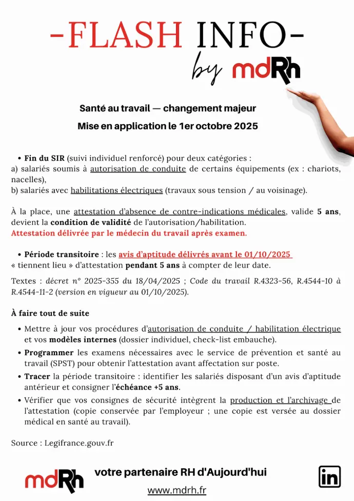 Face à une démographie médicale en baisse dans les services de prévention et de santé au travail, un décret écarte de la liste des salariés bénéficiant d'un suivi individuel renforcé (SIR) les postes qui requièrent la délivrance d’une autorisation de conduite ou d’une habilitation électrique. À la place, une attestation justifiant l'absence de contre-indications médicales sera nécessaire à ces travailleurs pour obtenir l’autorisation de conduite ou l’habilitation électrique.